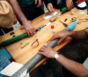 Nous avons peu de temps pour adapter nos fusées à la rampe du style 'tringle à rideaux': comme vous le voyez, on cheville des roulettes sur le corps de la fusée, dont les ailerons ont été modifiés comme convenu."