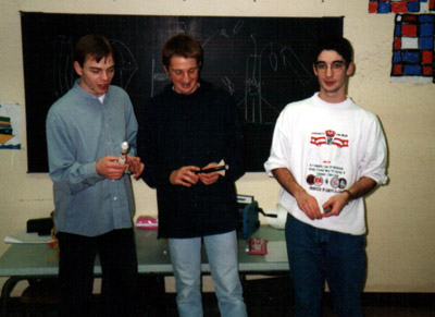 Trois joyeux drilles (dans l'ordre, Jonathan Bailleul, Damien Chevalier, Pierre Mazein) passionnés par la construction de fusées depuis la Terminale, dès lors que leur prof de physique a eu l'inconscience d'expliquer la formule de la "Poudre Noire" en cours... Depuis, un processus irréversible s'est enclenché et a fini par les conduire a la réalisation de fusées dans le cadre de l'association Jeunes Sciences Bordeaux, sous contrôle de l'ANSTJ et du CNES. |